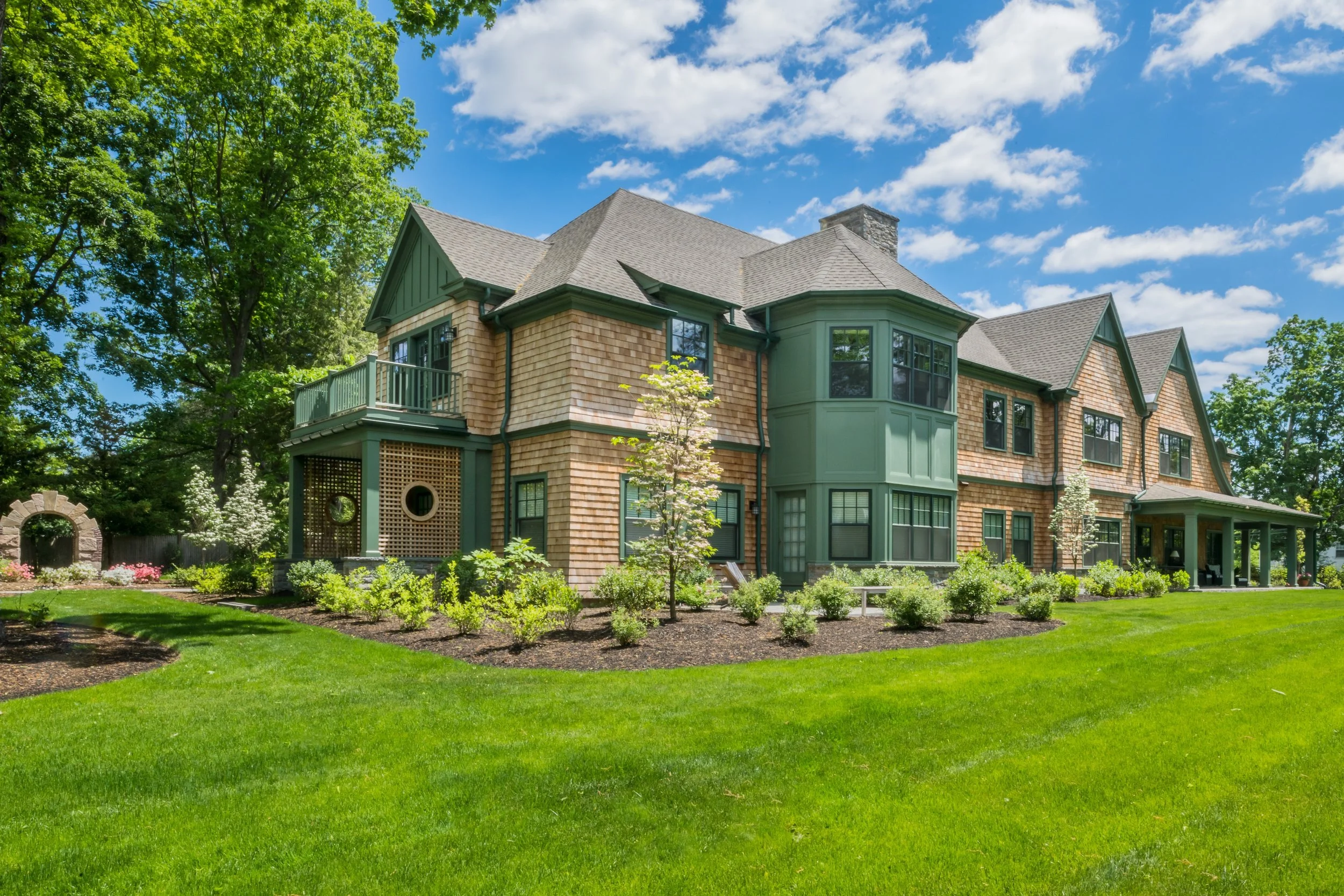 The Shingle Style architecture is adopted to meet well with the nature of the site and the building concept emulating a surviving seasonal cottage estate house. Defined and unified by a softly textured, predominantly shingled skin which is flared and curved in ways that reflect a more organic architecture, with deep eaves and steeply pitched roofs the style welcomes a siting closely set among the trees in a way few other styles may. Another hallmark of the Shingle Style is its embrace of a pleasingly naturalistic variation of detail, such as window patterns, dormer types, roof lines, accent siding materials, and trim elements; all of which work in concert to lend even a substantial structure an informal grace.